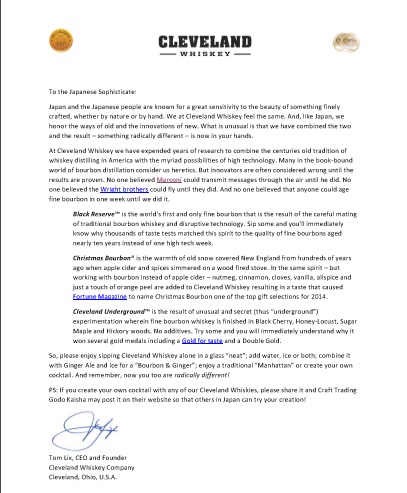 クリーブランド ウイスキー CEO & ファウンダーである Tom Lix氏 から日本のお客様へのご挨拶